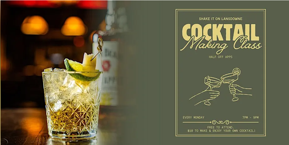 Spots are limited, and we recommend reserving ahead. The easiest move is to head to our Events page and book through the Eventbrite listing for Shake It On Lansdowne — Monday Cocktail Making Class.